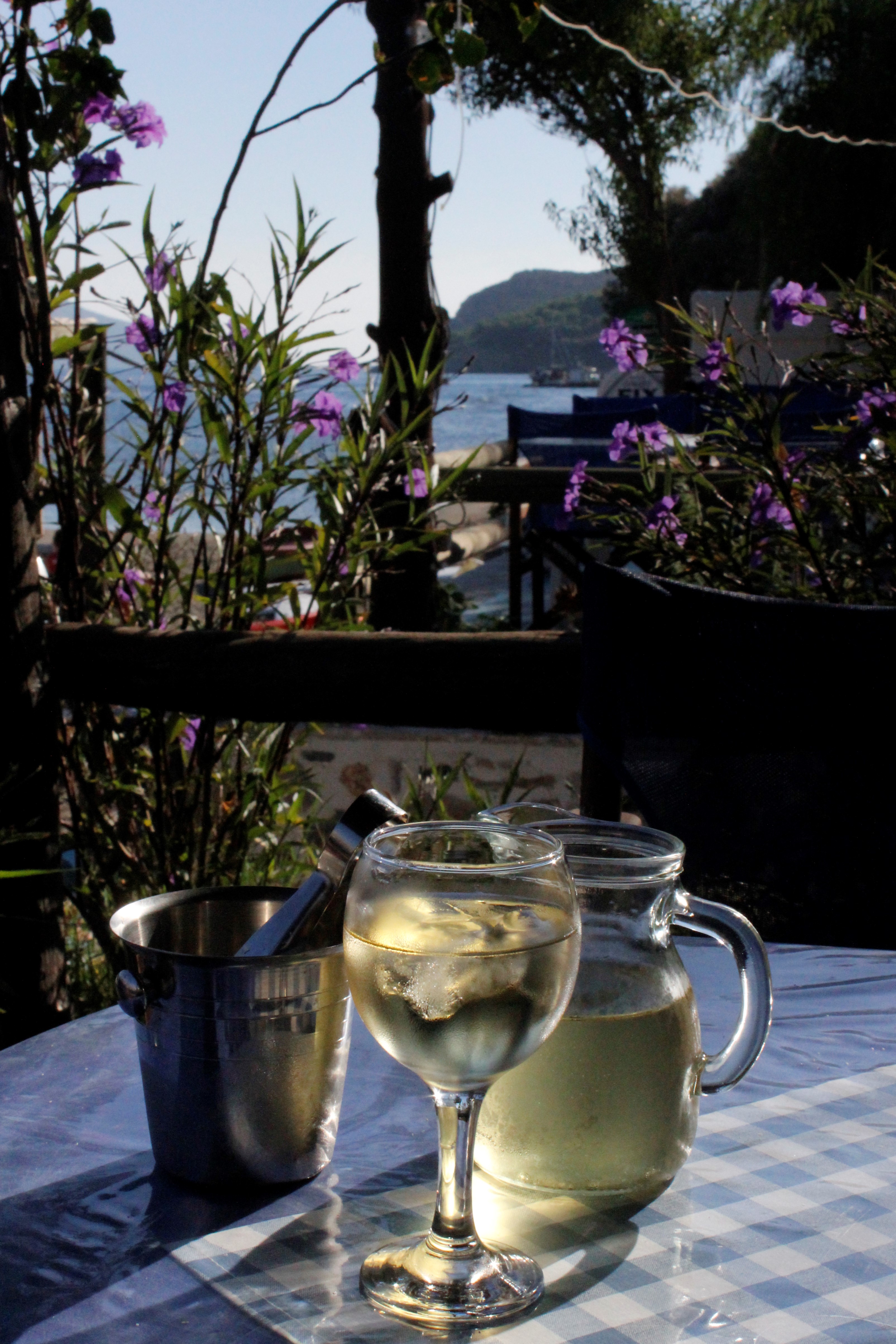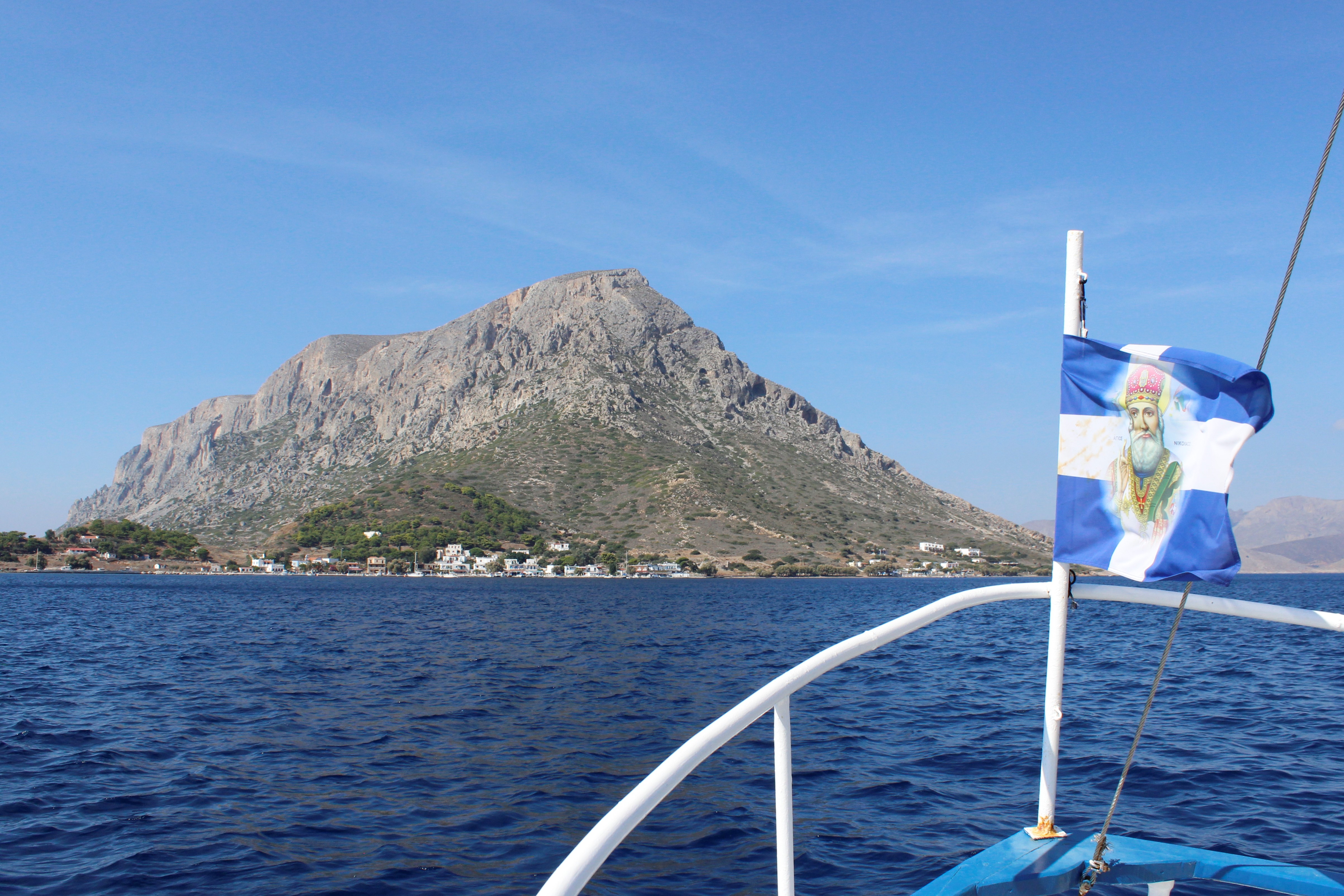 I packed this morning so when I got back to the hotel I only had to check out, I rang ahead to some studios in Xirokambos, the port I’ll be arriving, and then headed off. I’m sat in the small beachside restaurant by Myrties jetty writing this, after slugging the still too heavy bag 20 minutes up and down lanes to get here, and I’m waiting for the ferry which will leave at 5pm. I have a large beer in hand and am contemplating one last taste of delicious Kalymnos fare when I can’t help but notice how choppy the sea seems to be getting……at least there’s only outside seats on the tiny boat I’m getting to Leros….let’s hope the bag doesn’t sink it!!